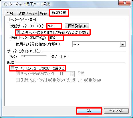 I [詳細設定]タブを選択し、[送信メール(SMTP)]の欄に数字で[587]を入力し、
