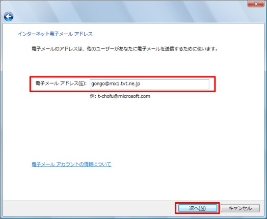 D [次へ]をクリックします。 E [電子メールアドレス]を入力します。
