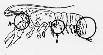 | ザリガニの足は、ハサミも入れて胸に5本ずつ10本、腹にもう5本ずる10本の足があります。もう6本あるのですが次のうちどこでしょうか。 |