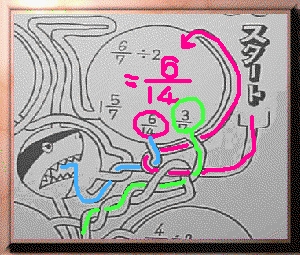 まず、鉛筆を持って、スタートに行きます。 スタートからめいろをたどると初めての問題に行き着きます。 問題を解いて、もし間違いなら、空色の線のようにサメに出くわします。ここで、子どもは、自分の間違いに気づきます。 これを、見直しシステムと言います。正解だと次の問題にゆける訳です。 こうして、楽しみながら問題を解くうちにどんどん力が着くわけです。しかも、最新の心理学の研究によると、めいろは右脳を開く役割があるというのです。つまり、計算などの算数の問題を解けば左脳が開き、めいろを解くと右脳が開くのです。 |