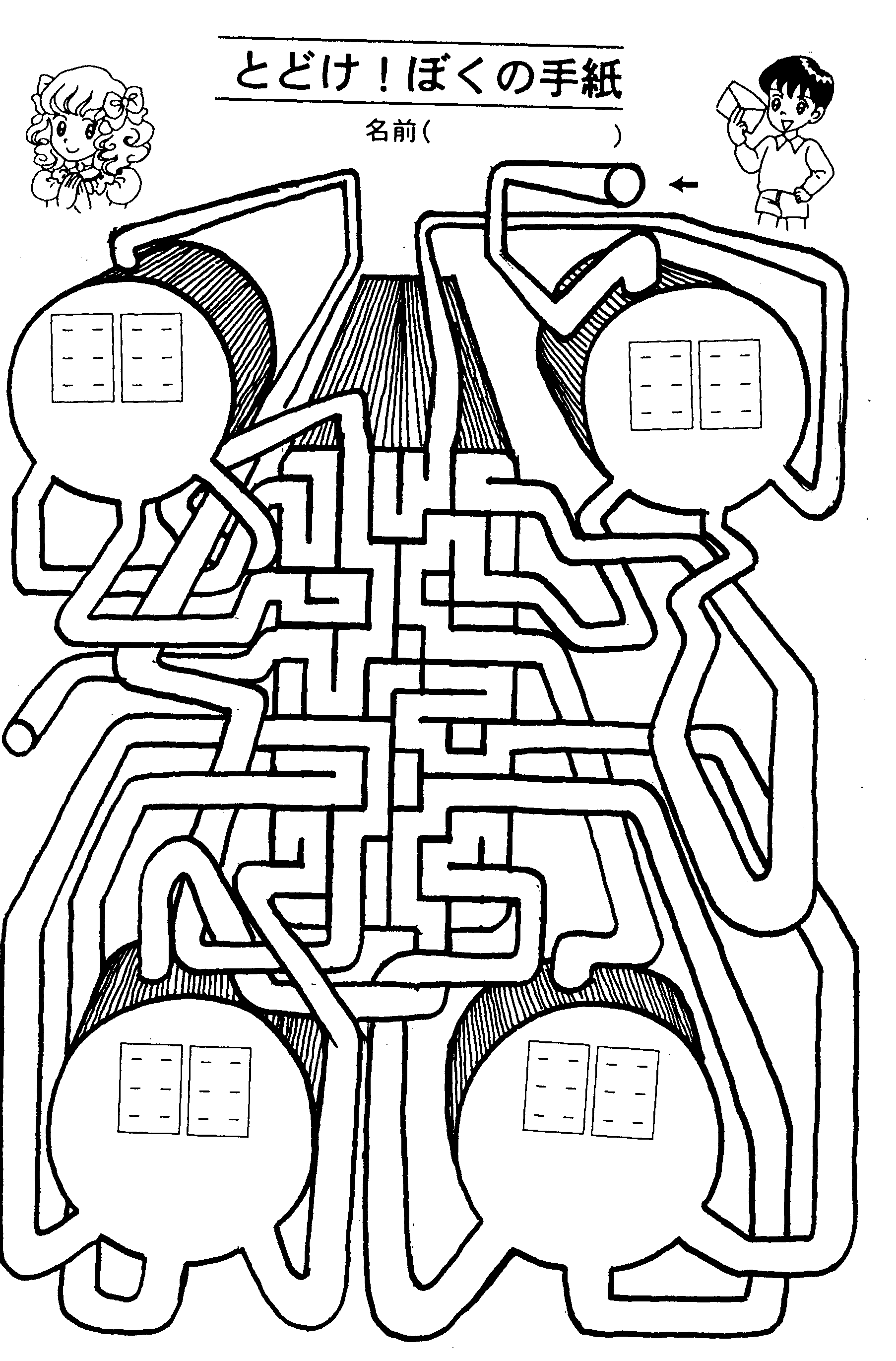 今、学習ゲームの開発が子ども達に大好評である。開発したゲームは、総合学習の時間や朝の学習などに行う。ルールは、簡単だ。行き止まりに出会ったら間違いで、次の問題にたどりつけたら正解である。「法則化算数教科書学習ゲーム」(明治図書)と同じルールだ。右のゲームは、点字が書き込めるように製作した「点字学習ゲーム」である。点字を完成させて、誤答と二つと正答を一つ書けば完成である。中の迷路にペンで壁を書き加えたり、修正液で壁を消したりすれば、何通りものゲームが開発できる優れものである。是非、お試しいただきたい。