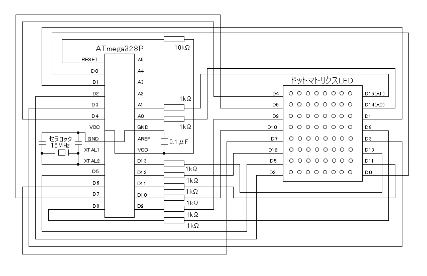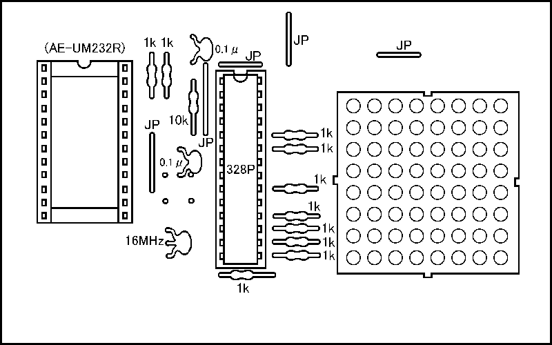 市販されているArduino Uno は安いものでも2,520 円もするが,秋月電子のAE-UM232Rモジュール(@950円)とAVRマイコンATmega328Pを利用することで最小限のArduino互換機を作ることができる。Unoには電源回路もあるが,ここではUSBの5Vを利用するため,電源回路は省略する。8×8マトリクスLEDは,同じく秋月電子のOSL641501-ARA(@200円)を使用する。