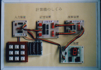 これはコンピュータのしくみを理解させるための教具で,TTLのICを用いて1桁の足し算をする回路を組んだものである。入力,記憶,演算,出力の4つの回路をそれぞれ1枚の基板に配線しており,各部分でデータの様子を4つ(4ビット)のLEDで示している。各回路の「制御」はスイッチを手動で開閉して行う。