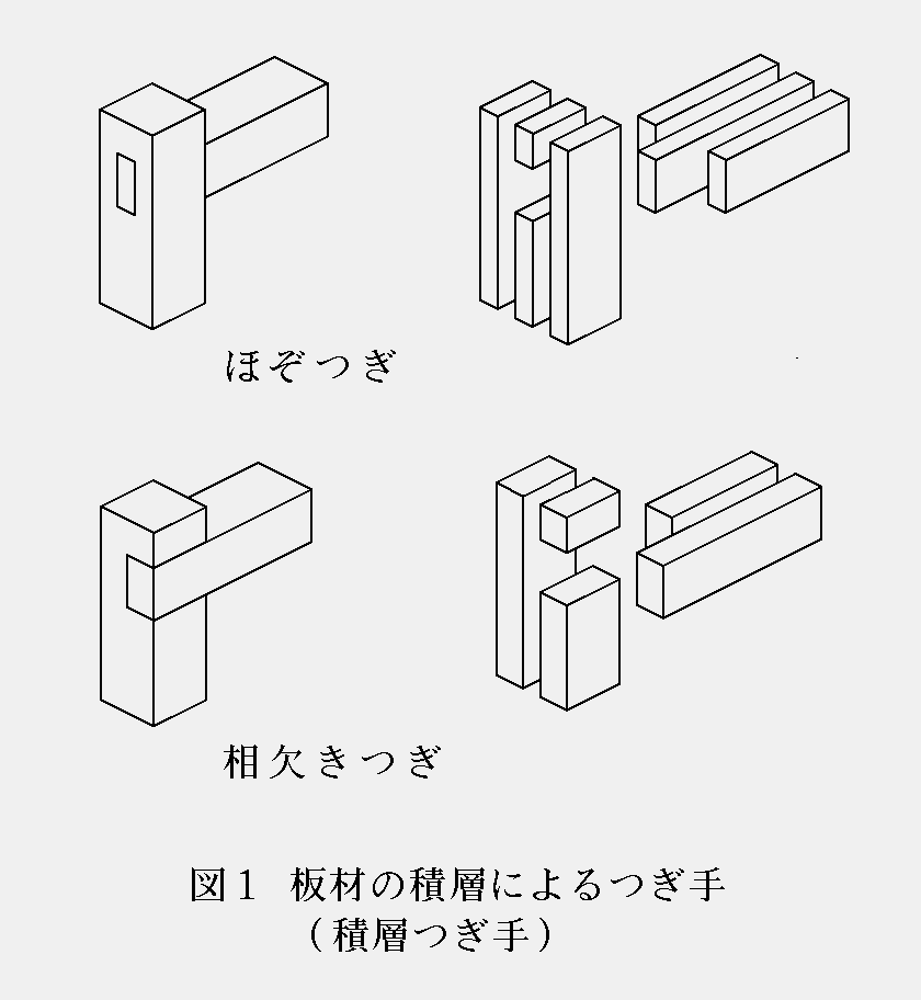 そこで,ほぞつぎや相欠きつぎのような接合を板材の積層により作る方法(以下「積層つぎ手」という。)で行うことを考え,それを利用した題材を開発することを試みた。この方法によれば接合部分の強度の向上も期待でき,題材の種類を多様にするとともに,利用可能な木材の範囲を広げることができるものと思われる。