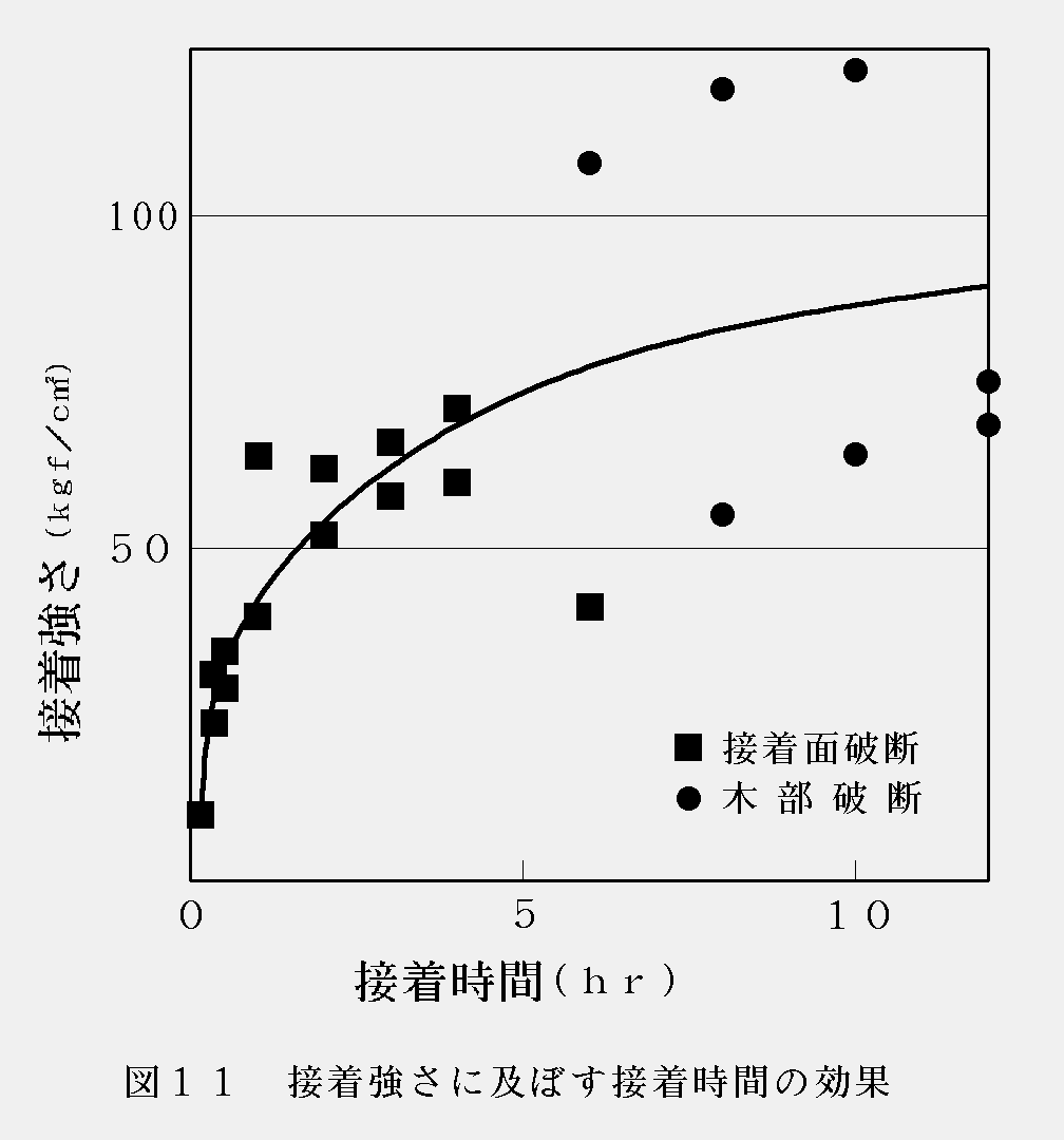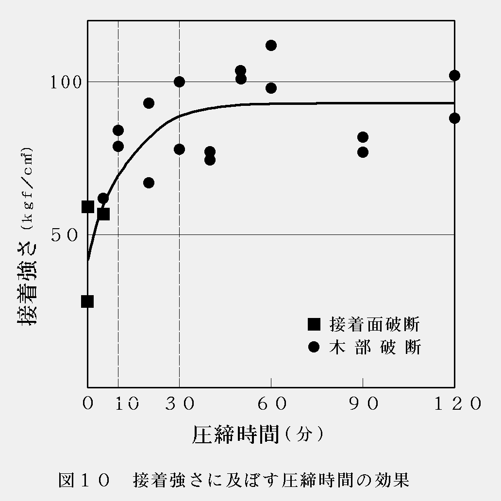 試験結果を図10に示す。圧締時間が30分までは接合強さとの相関関係が認められるが,それ以上では相関関係はほとんど見られない。また,10分以上の試験体ではすべて木部で破断が起こっている。このことから圧締圧力を与える時間は,30分程度で十分であると言える。