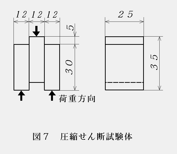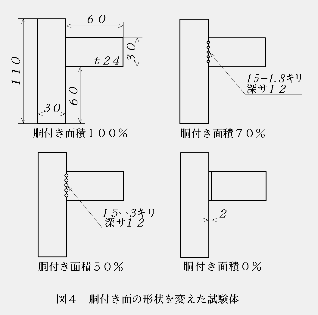 図4は試験体の形状を示したものである。試験結果を図5に示す。やはり,接合強度に及ぼす胴付き面積の影響は大きく,丈夫な積層つぎ手を作るにはできるだけ胴付き面を正確に仕上げる必要があることが分かる。
