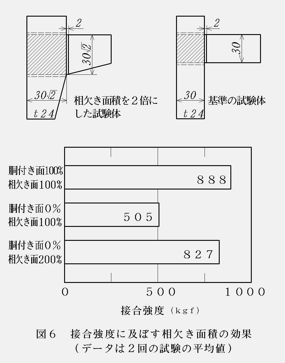 しかし,胴付き面の接合力が期待できない場合でも,相欠き面(または,ほぞ面)の面積を増すことによって必要な強度を得ることが可能である。図6は相欠き面積を2倍にした試験体及びその接合強度試験の結果である。胴付き面積は0であっても相欠き面を2倍にすれば,胴付き面積が 100%のものと同じ程度の接合力を得られることが分かる。題材の開発に当たっては,相欠き面が大きくなるように設計することが大切である。