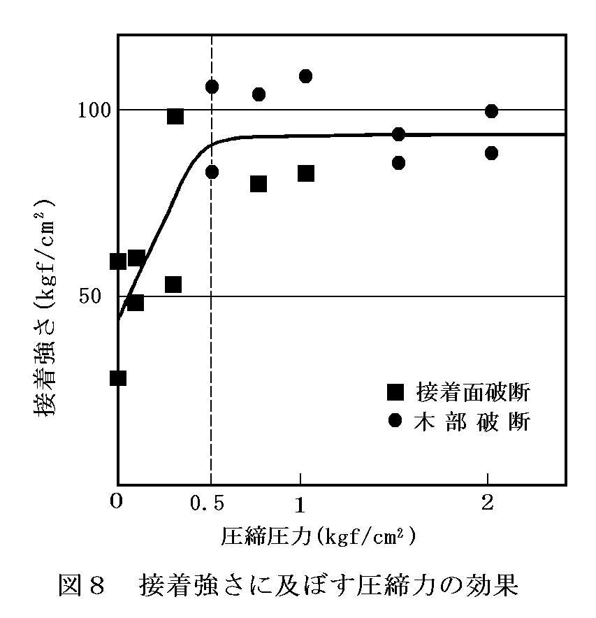 圧締圧力を変えて作った試験体の圧縮せん断試験を行うことにより,圧締圧力と接着強さとの関係を調べた。