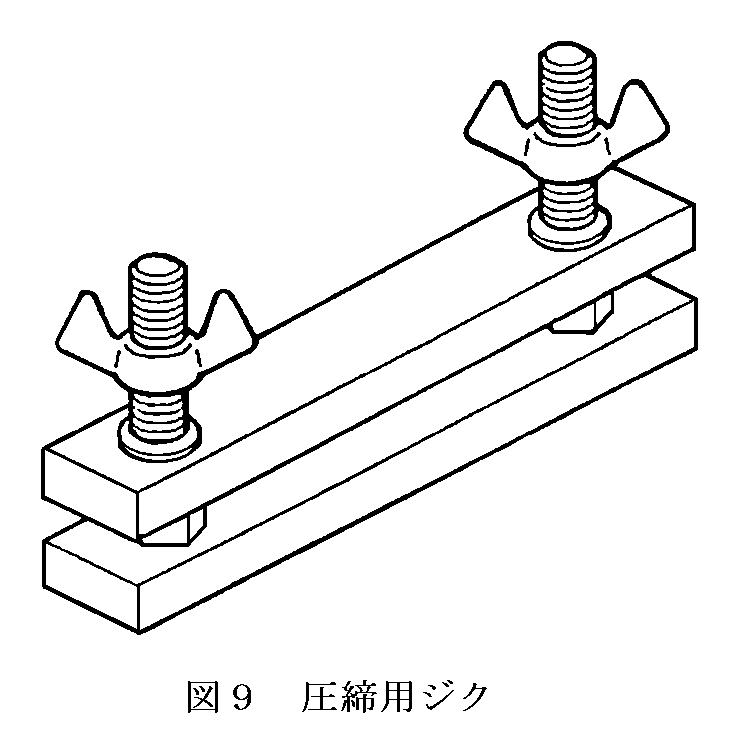 1kgf/cu程度の圧締圧力を得るためには,特別な圧締工具などは不要であり,ボルトやナットを使った簡易なジグで十分である。図9は直径8mmのボルトとちょうナットを用いた圧締用ジグの例である。